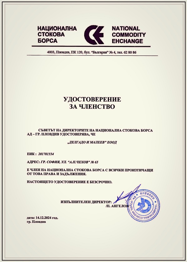 Being a full member registered with the Sofia Commodity Exchange AD and the National Commodity Exchange AD, the company carries out qualified brokerage activities in the purchase and sale of goods traded on the commodity exchanges.